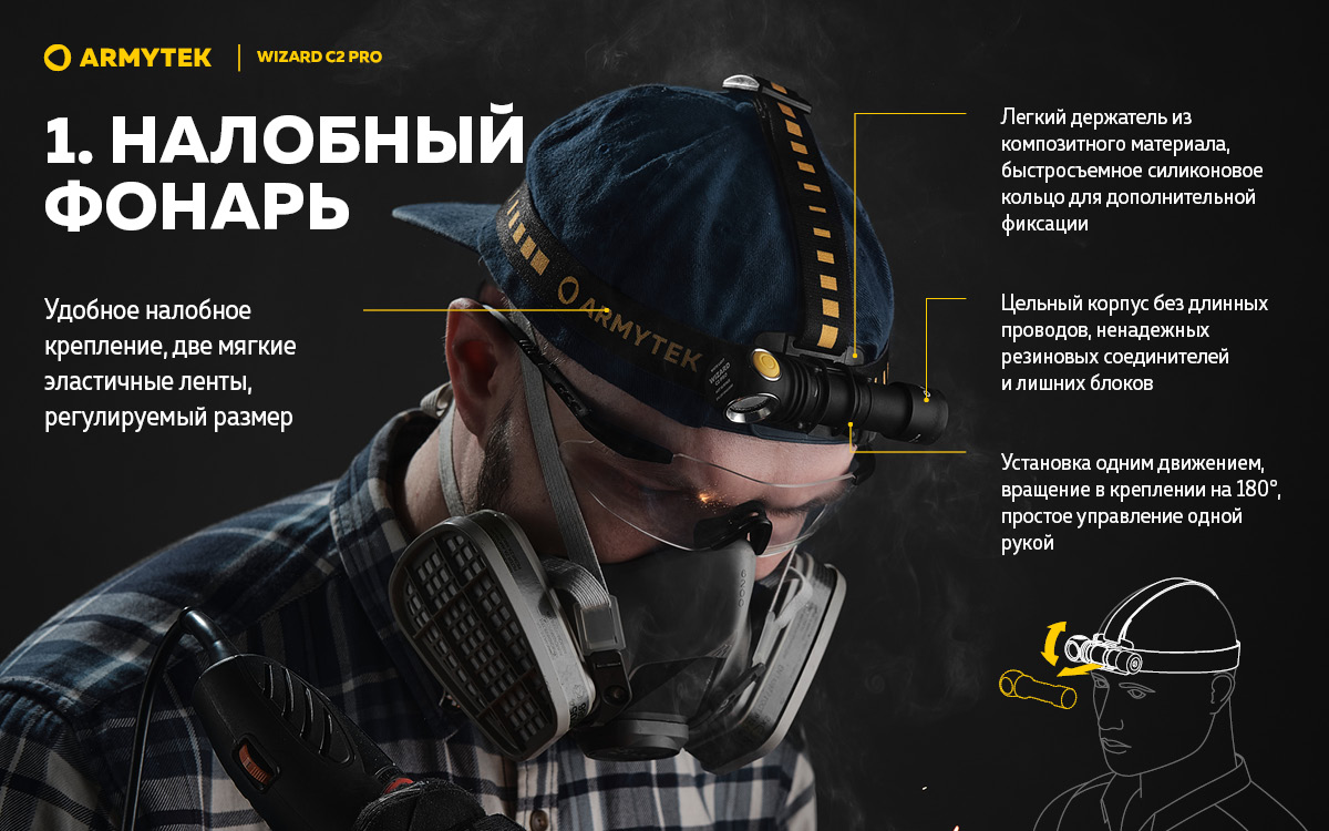 - Простое управление одной рукой, надежное налобное крепление для бега