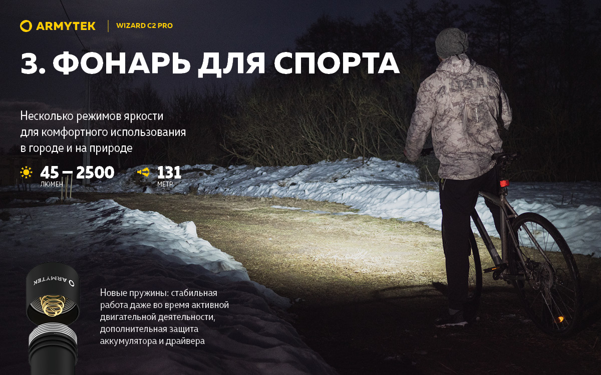 - Pro Мощная электроника обеспечивает впечатляющий световой поток в 2500 люмен и рекордные 200 дней работы в режиме Светлячок.