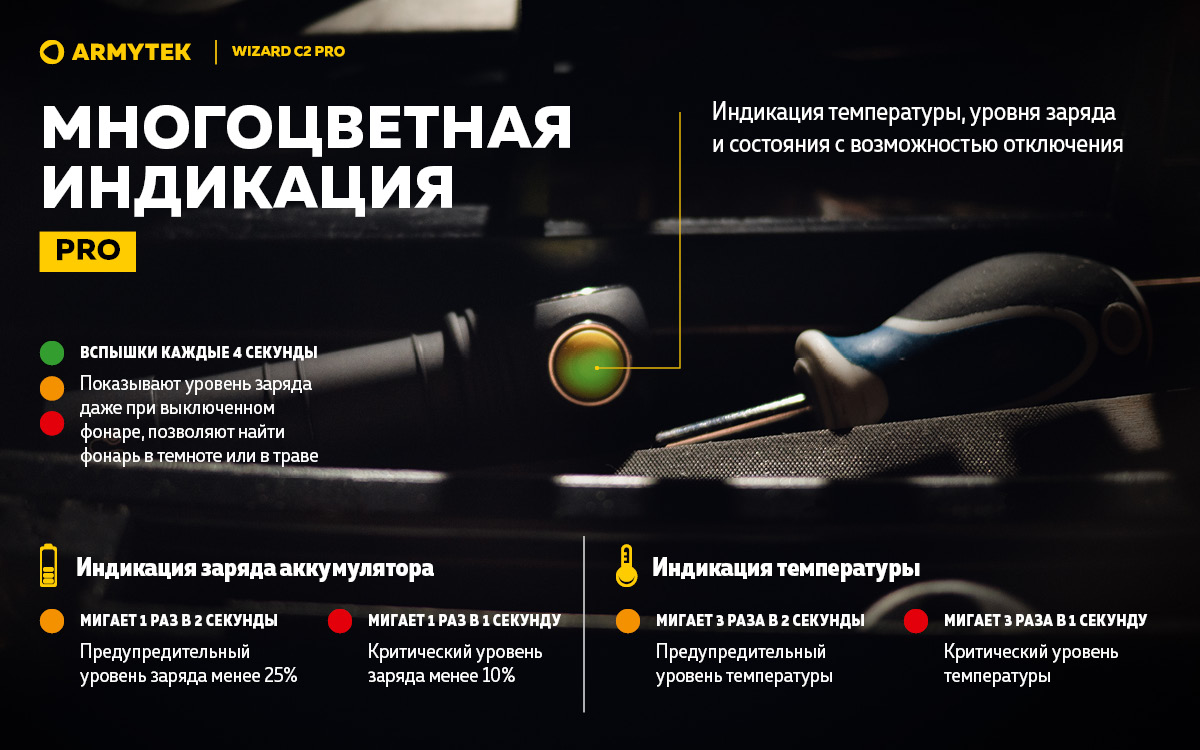 - Pro Многоцветная индикация высокой температуры и состояния батареи, которая работает на протяжении 25 лет, помогает обнаружить фонарь в темноте.