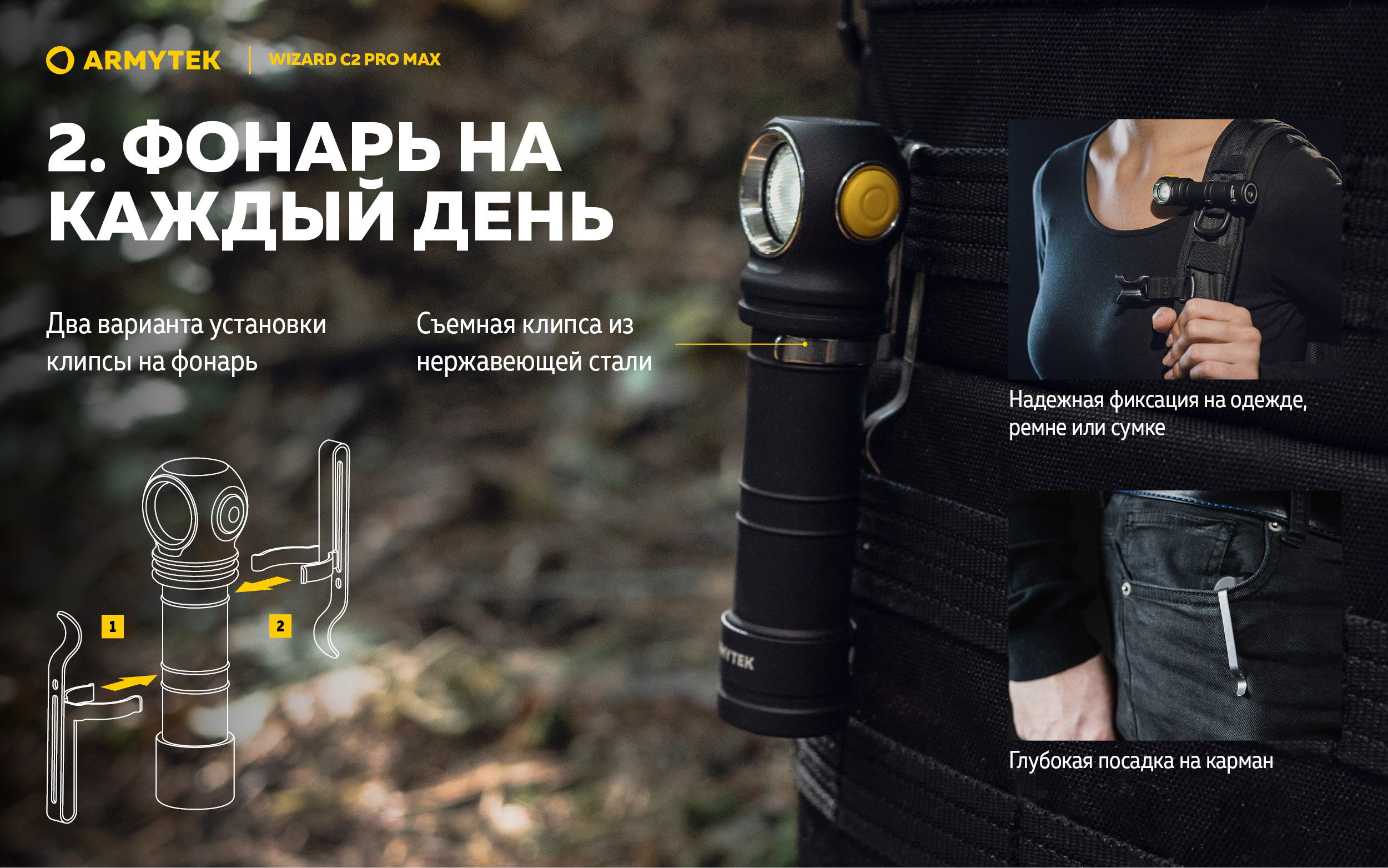Съемная клипса из нержавеющей стали имеет два варианта установки на фонарь, обеспечивает надежную фиксацию на одежде, ремне или сумке, а также глубокую посадку на карман.