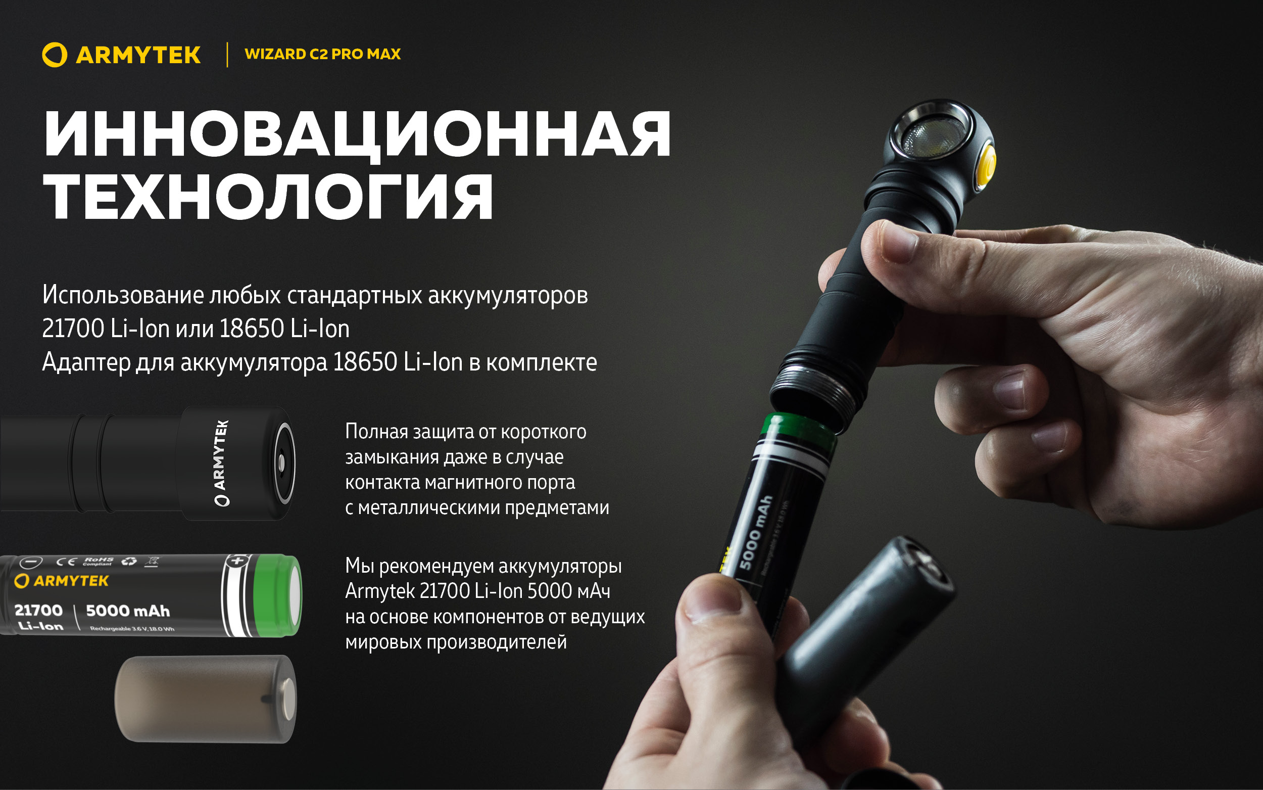 Для эффективной работы фонаря рекомендуем фирменные аккумуляторы 21700 Li-Ion. Также совместно с адаптером можно использовать аккумуляторы 18650 Li-Ion длиной не более 70 мм диаметром до 18.7 мм и допустимым разрядным током не менее 15А.