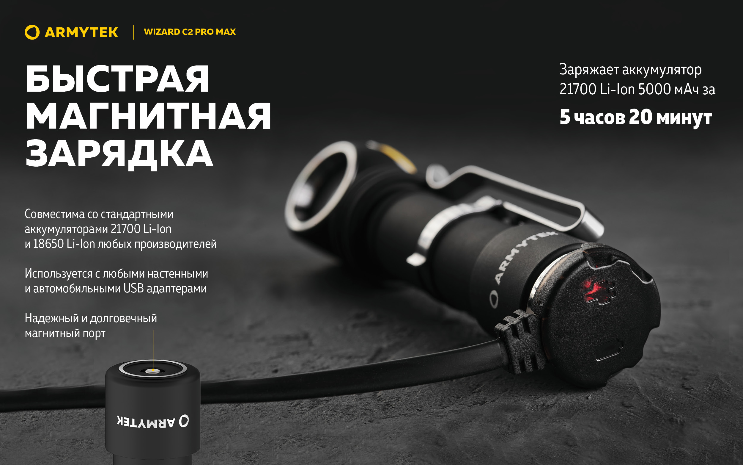 Быстрая магнитная зарядка: комплектный аккумулятор 21700 Li-Ion 5000 мАч заряжается за 5 ч 20 мин.