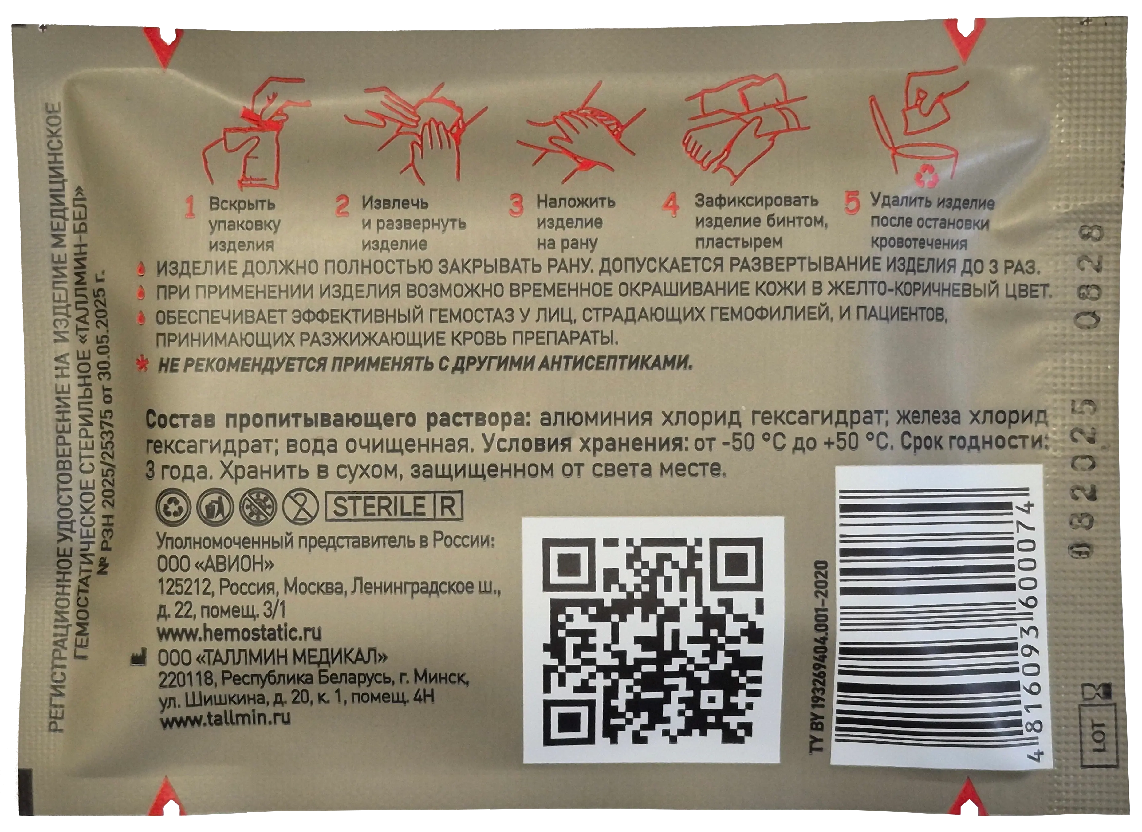 ГЕМОСТАТИК “ТАЛЛМИН-БЕЛ” является местным кровоостанавливающим средством, представляющим собой изделие из текстильных материалов, пропитанных специальным гемостатическим раствором, разработанным специалистами ООО “ТАЛЛМИН МЕДИКАЛ”, Республика Беларусь.