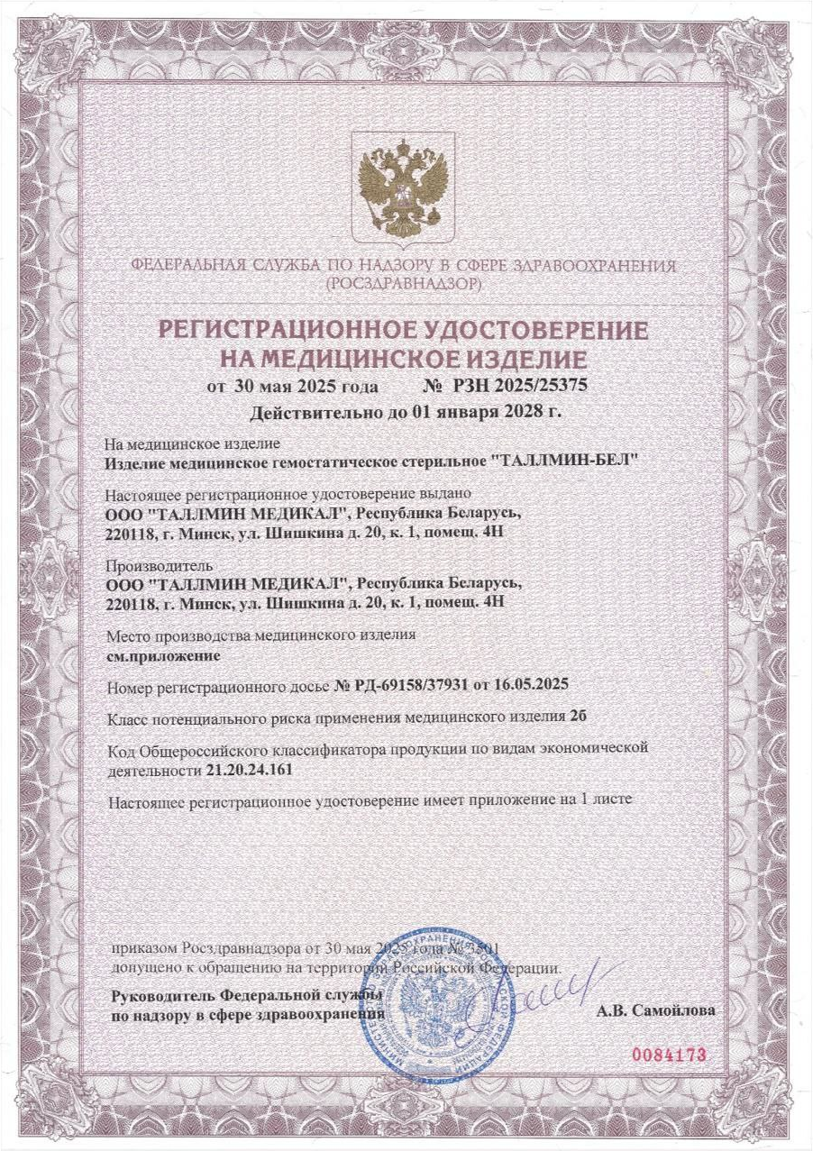 ГЕМОСТАТИК “ТАЛЛМИН-БЕЛ” (TALLMIN-BEL) — уникальный гемостатик, который останавливает кровотечение независимо от текучести крови и состояния пациента.