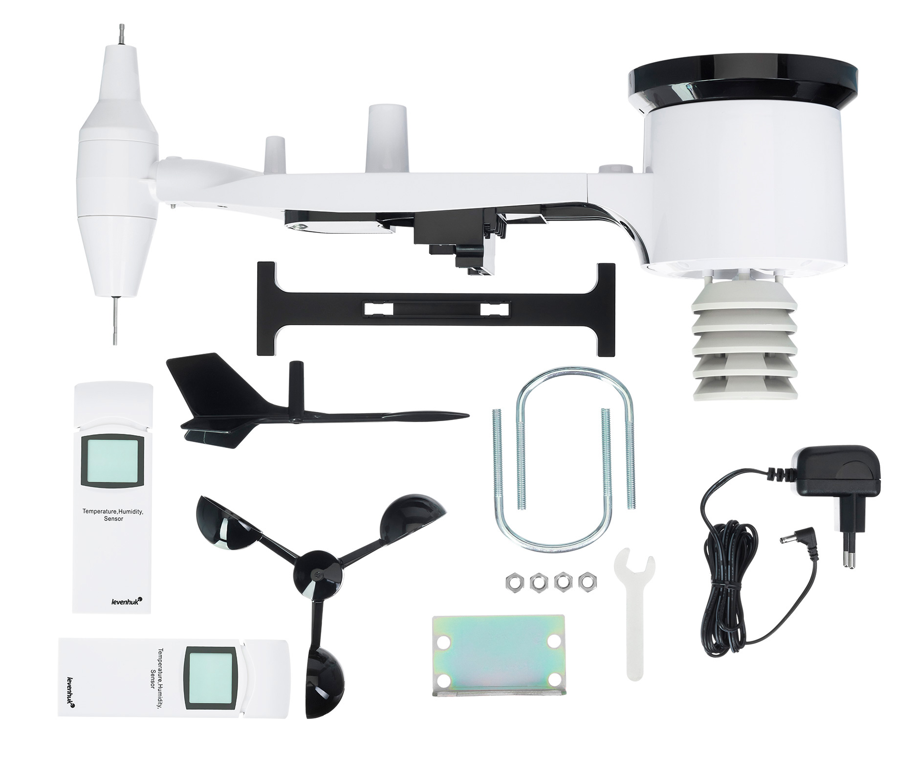 - Выносной радиодатчик «9 в 1» на батарейках с дополнительным питанием от солнечной панели, а также 2 термогигродатчика в комплекте