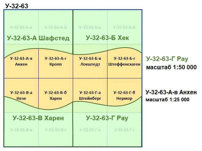У-32-63-Б-г (ШТЕФФЕНСХАГЕН), масштаб 1:25 000, в 1 сантиметре 250 метров;